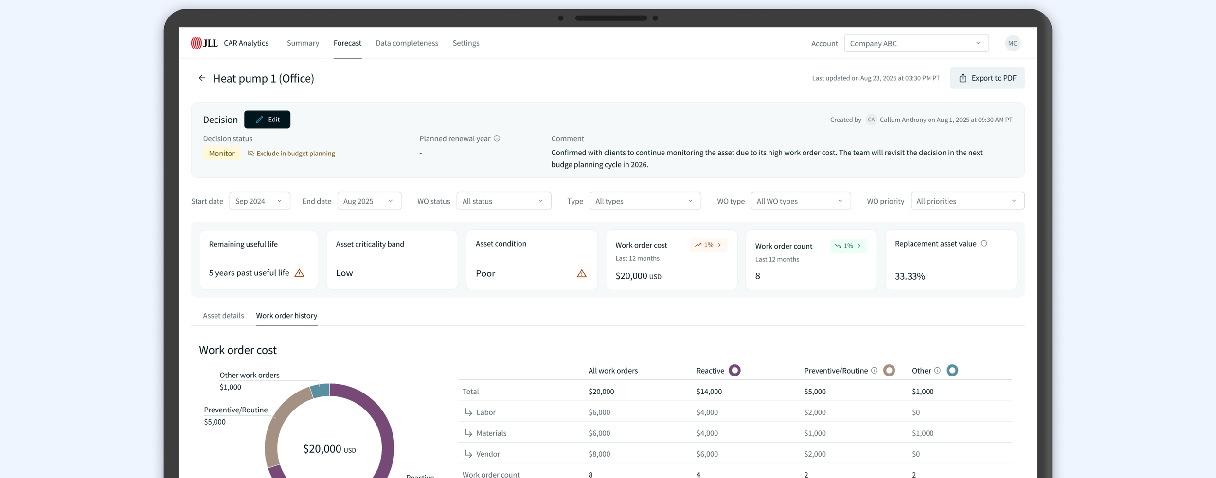 Their role involves monitoring large portfolios of equipment assets and recommending which assets should be replaced as part of the client’s budget planning process.