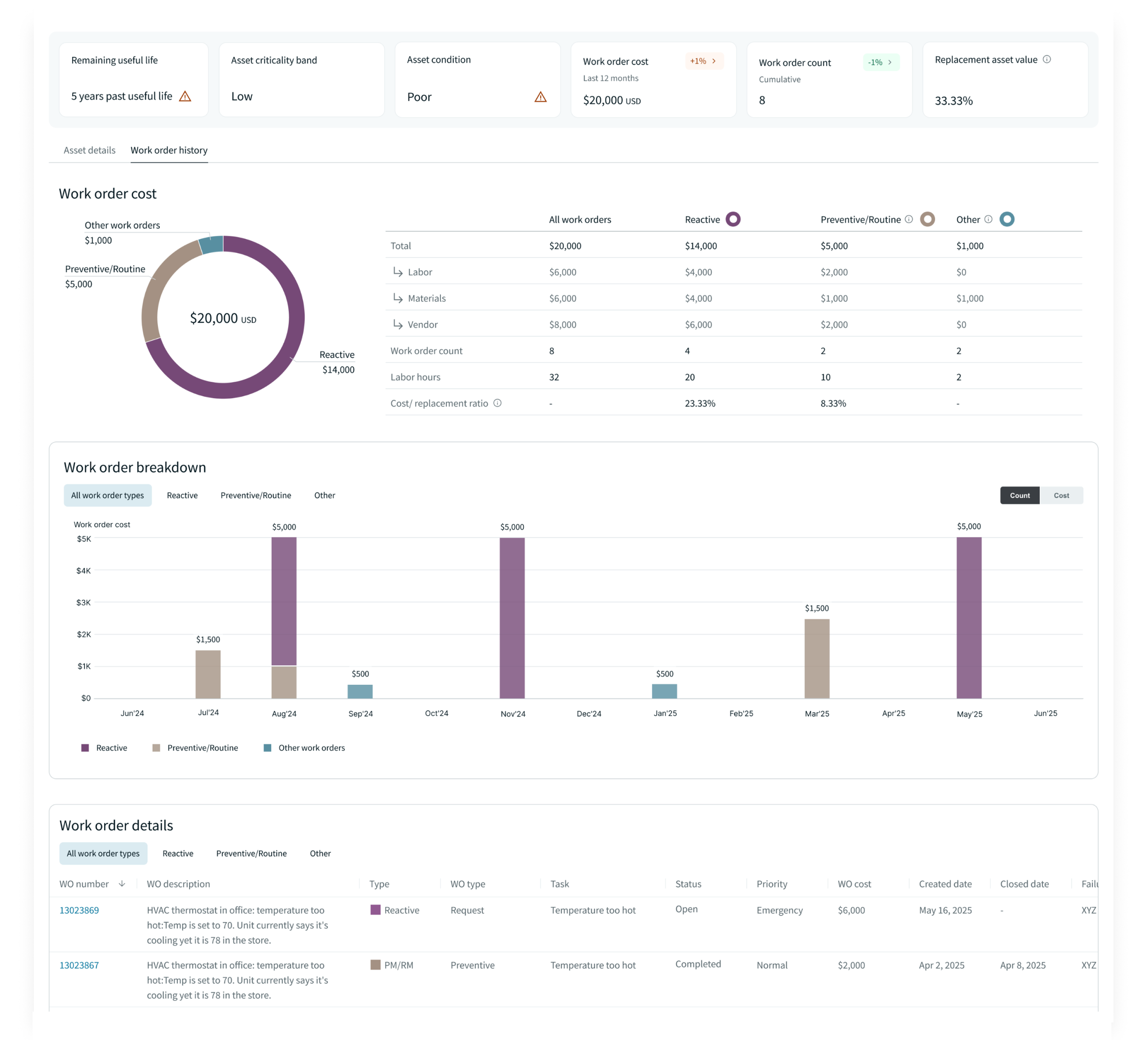 The redesigned asset detail view consolidates works and repair information directly within the application. The layout is organized to support easy comparison between different types of works and repairs. A high-level summary at the top provides a quick overview of the most important work types, while a detailed section at the bottom allows users to dive deeper when needed. This approach enables faster, more informed decision-making without context switching.